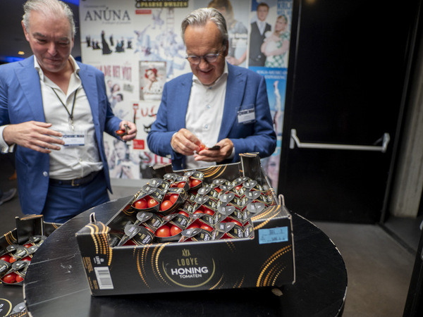 Rob Banken (l) van Banken Champignons proeft van Looye honingtomaten