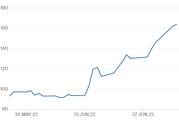 De gasprijs voor 'winter 2022' tot en met 5 juli op de Title Transfer Facility, het Nederlandse gashandelsplatform. Voor heel 2022 lag de gasprijs vanochtend lager dan gisteren, een daling van ongeveer 10 euro per megawattuur tot +-155 euro per megawattuur was rond 10.30 het geval. Klik hier voor de actuele prijzen.