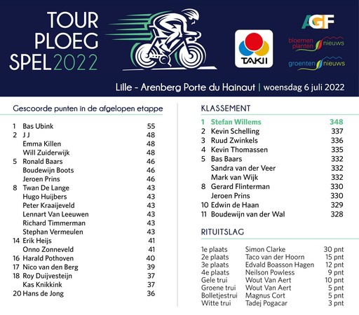 Niemand heeft Simon Clarke in zijn ploeg in het Takii Tourploegspel. Zonde, want zijn zege in de kasseienrit gisteren had 30 dure punten opgeleverd. Nu ging Bas Ubink er met de dagzege aan de haal. Hij had de nummers 2 en 3 uit de echte Tour in zijn team.