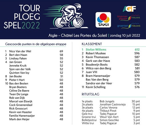 De gele trui hangt om de schouders bij de Sloveen Pogačar. In het Takii Tourploegspel ook geen wijzigingen. Stefan Willems blijft aan kop staan.