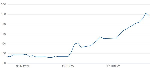 De gasprijs voor 'winter 2022' tot en met 8 juli op de Title Transfer Facility, het Nederlandse gashandelsplatform. Klik hier voor de actuele prijzen.