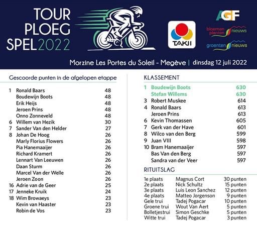 Even leek Dylan van Baarle gisteren richting de ritzege te fietsen, maar uiteindelijk reed besnorde Deen naar de zege. Magnus Cort Nielsen kwam als eerste op het vliegveld van Megève aan. Het levert in het Takii Tourploegspel een dagzege op voor vijf spelers, waarbij met Boudewijn Boots één van die vijf ook aan kop van het klassement komt. Stefan Willems en Boudewijn delen voorlopig de virtuele gele trui.