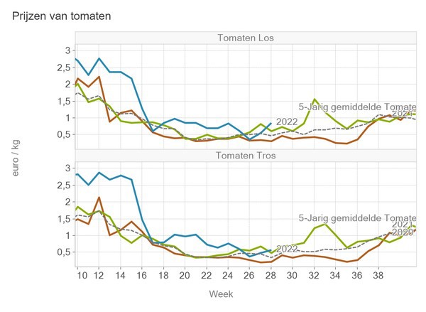 Voor losse tomaten kwam de middenprijs over week 28 uit 85 eurocent per kilo. Trostomaten leverden per kilo gemiddeld 57,2 eurocent op. Een blik op de volumes leert dat die voor trostomaat ruim 7 procent hoger liggen in vergelijking met vorig jaar. Het aangevoerde volume losse tomaten ligt net iets onder dat van vorig jaar.
