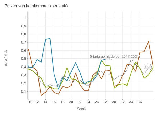 De komkommerprijs steeg afgelopen week nog iets verder door. De gemiddelde stuksprijs kwam uit op 49,2 eurocent in week 28. Momenteel zijn telers teelt aan het wisselen. Verder speelt mooi weer de afzet van komkommers vaak in de kaart.