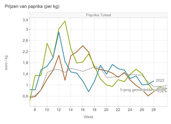 De middenprijs voor paprika is na enkele weken weer boven het vijfjarig gemiddelde uitgekomen. Met een stijging van de middenprijs voor rode paprika in week 28 naar ruim 1,14 euro per kilo liggen alle kleuren boven het vijfjarige middelde, want dat geld ook voor geel en oranje. Afgelopen week stegen de aantallen gestaag en zakten de prijzen. Oranje en geel werden het best betaald, groen het minst.