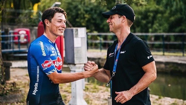Lieven van Lommel (l) van Foodmaker met een van de renners van Alpecin-Deceunick, foto LinkedIn