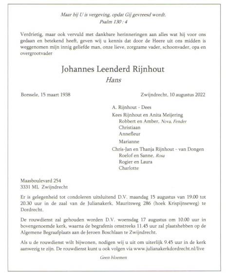 De begrafenis zal woensdag 17 augustus plaatsvinden op de Algemene Begraafplaats in Zwijndrecht. Maandag 15 augustus is er gelegenheid tot condoleren, zie onderstaande rouwkaart.