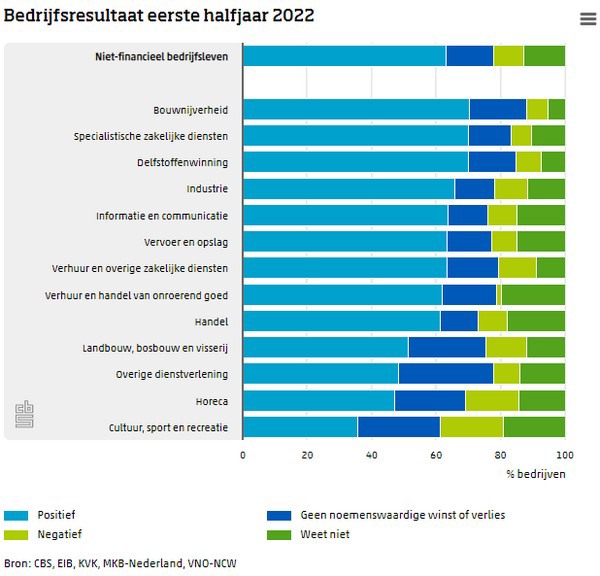 Het eerste halfjaar van 2022 is door 63 procent van de ondernemers met winst afgesloten. 9 procent maakte verlies en 15 procent gaf aan geen noemenswaarde winst of verlies gemaakt te hebben. In de bedrijfstakken cultuur, sport en recreatie en de horeca waren ondernemers het minst positief over hun bedrijfsresultaat.
