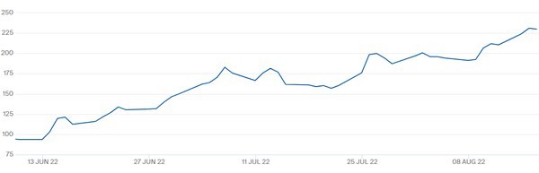 De gasprijs voor 'winter 2022' tot en met 17 augustus op de Title Transfer Facility. Bekijk hier de actuele cijfers.
