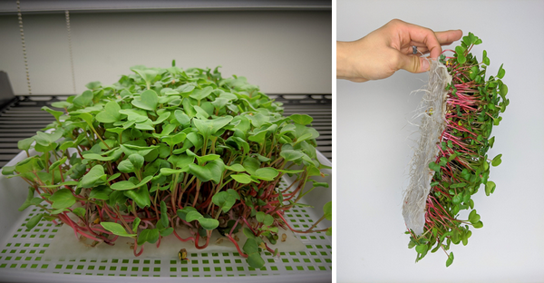 De bamboemat van VegBed bestaat uit organische materialen en is bedoeld voor de teelt van microgroenten. "Het is niet gemakkelijk om een stijve substantie te maken zonder er lijm aan toe te voegen."
