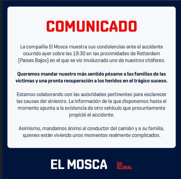 Het Spaanse transportbedrijf El Mosca heeft in een statement haar medeleven betoond aan de nabestaanden van het ongeluk zaterdagavond in Nieuw-Beijerland. Bij het ongeluk vielen zes doden, waaronder een AGF'er, zoals gisteren op deze site te lezen was.