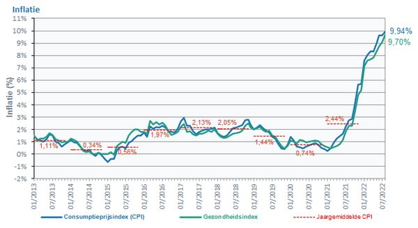 De Belgische inflatie stijgt in augustus van 9,62% naar 9,94%. Ze bereikt daarmee het hoogste niveau sinds maart 1976, toen de inflatie uitkwam op 9,96%, zo meldt Statbel. Ook in Nederland stijgt de inflatie, met 13,6% in augustus.