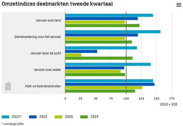 De omzet van de transportsector was in het tweede kwartaal van 2022 ruim 32 procent hoger dan in het tweede kwartaal van 2021. De post- en koerierdiensten bleven als enige deelmarkt achter. Dit meldt het CBS op basis van nieuwe cijfers.