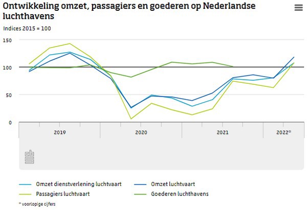 In de luchtvaartsector is de omzet in het tweede kwartaal 124 procent hoger dan in het tweede kwartaal van 2021. De luchtvaart werd in de voorgaande kwartalen hard getroffen door de coronamaatregelen. De meeste beperkende coronamaatregelen zijn in het tweede kwartaal opgeheven. Hierdoor was vliegen weer meer mogelijk.