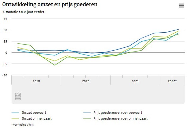 De omzet van de zeevaart (+43 procent) en de binnenvaart (+48 procent) is in het tweede kwartaal hoger dan in hetzelfde kwartaal vorig jaar. Dit komt voornamelijk door hogere prijzen. De prijsstijging voor de zeevaart was ruim 50 procent en die van de binnenvaart ruim 40 procent. Bij de zeevaart spelen ontwikkelingen op de wereldmarkt een grote rol. De binnenvaart had in het tweede kwartaal te maken met lage waterstanden. Dit was van grote invloed op de prijs (laagwatertoeslag). Dit zal in het derde kwartaal een nog grotere rol gaan spelen.