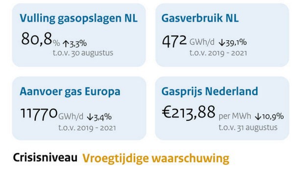 De gasvoorraden raken steeds beter gevuld. (de Haagse update van 9 september hierover is hier in te zien). In Frankrijk, Engeland en Spanje is het effect daarvan al te zien in de dagprijzen, stippen de specialisten aan: de prijzen noteren ca 100 ct/m3, terwijl de prijs in Noordwest- en Oost-Europa rond 200 ct/m3 ligt.