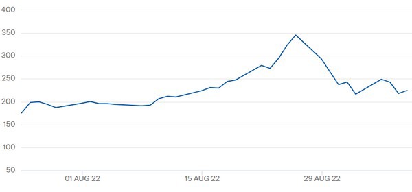 De gasprijs voor 'winter 2022' tot en met 8 september op de Title Transfer Facility. Voor de resterende maanden van 2022 lag de gasprijs tegen 11u vrijdagochtend tussen de 210-215 €/MWh. Bekijk hier de actuele cijfers.