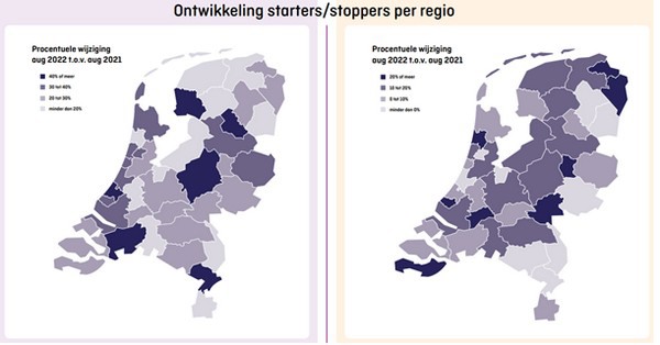 In de regio Alkmaar kenmerkte afgelopen augustus ten opzichte van augustus 2021 zich juist door een kleine toename van het aantal starters (op een na laagste van de COROP-regio’s) en een grote toename van het aantal stoppers (op een na grootste toename).