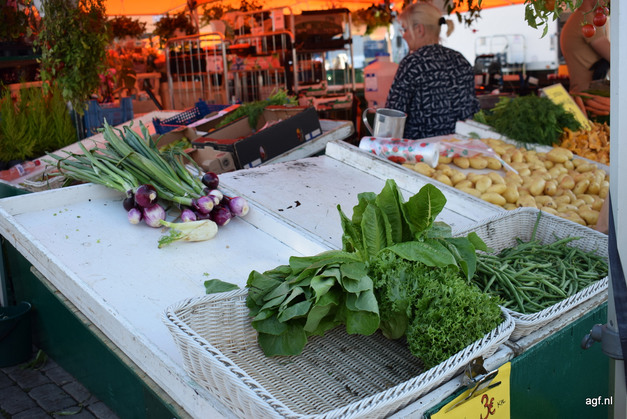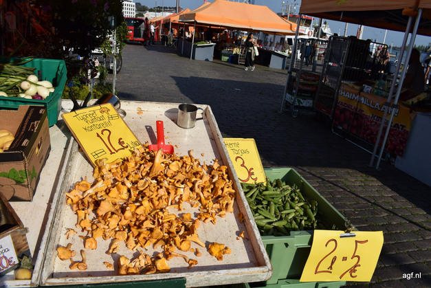 De markt is strak en georganiseerd, er is weinig onderscheid te maken voor de verkopers. Ze hebben allemaal de beschikking over een vierkante kraam met een feloranje tentdoek.