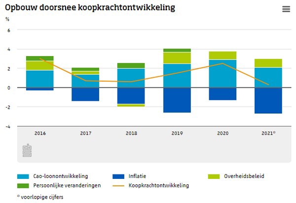 De koopkracht van de Nederlandse bevolking steeg in 2021 in doorsnee met 0,3 procent, de kleinste stijging in recente jaren. De koopkrachtontwikkeling werd onder meer beïnvloed door sterk stijgende prijzen in het najaar. Ruim 60 procent van de werknemers ging er nog in koopkracht op vooruit, maar voor 75 procent van de pensioenontvangers daalde de koopkracht. Dat blijkt uit nieuwe CBS-cijfers over de inkomens van de Nederlandse bevolking.