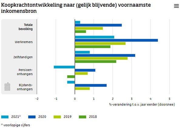 De koopkrachtontwikkeling is afhankelijk van de voornaamste inkomensbron van het huishouden waar personen deel van uitmaken. Personen in huishoudens met inkomen uit werk hebben doorgaans een hogere doorsnee koopkrachtontwikkeling dan in huishoudens met een uitkering als belangrijkste bron van inkomsten. Werkenden kunnen een periodieke loonsverhoging krijgen of hun inkomen verbeteren door ander werk te zoeken. In 2021 steeg de koopkracht van personen in werknemershuishoudens in doorsnee met ruim 2 procent. Het betreft in dit geval huishoudens met zowel in 2020 als in 2021 inkomen uit werk als belangrijkste inkomensbron. Voor personen met een pensioenuitkering ligt het aanboren van extra inkomstenbronnen minder voor de hand. In 2021 gingen zij er in doorsnee ruim 1 procent in koopkracht op achteruit.