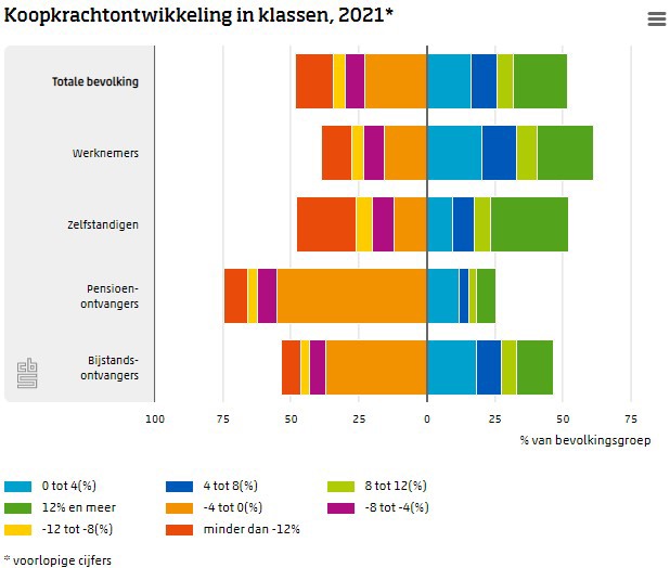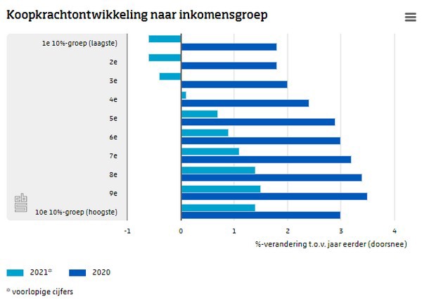 Individuele koopkrachtveranderingen onder de bevolking verschillen. De koopkracht nam in 2021 toe voor 52 procent van de bevolking en daalde voor de andere 48 procent. Voor 20 procent van de bevolking steeg de koopkracht met 12 procent of meer. Van de werknemers ging ruim 60 procent er in koopkracht op vooruit.
