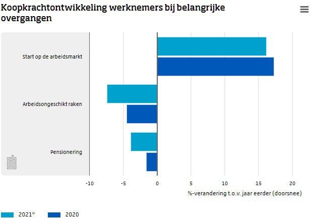 Wanneer de belangrijkste inkomstenbron van een persoon verandert, leidt dat doorgaans tot grotere koopkrachtschommelingen. Zo was in 2021 de koopkracht van startende werknemers op de arbeidsmarkt in doorsnee ruim 16 procent hoger dan in 2020 toen ze nog scholier of student waren. De koopkracht van net gepensioneerden, voorheen werknemers, lag in 2021 4 procent onder het niveau van 2020.