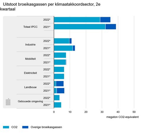 In het tweede kwartaal van 2022 was de uitstoot van broeikasgassen in Nederland 9 procent lager dan in hetzelfde kwartaal van 2021. Dat komt vooral door minder aardgasverbruik in de industrie, landbouw en de gebouwde omgeving, stelt het CBS bij nieuwe cijfers. In het eerste kwartaal van dit jaar was ook al een daling te zien.