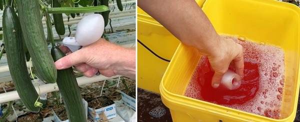 De hoeveelheid vloeistof die blijft stromen kan de teler met een schroefje afstellen. Hiervoor kan een teler een kleine inbussleutel gebruiken. Per medewerker zijn er twee messen, één blauwe en één rode Paul: “Als bij ons een rij geoogst is, wisselen de medewerkers van mes. Het mes gaat in een emmer met het ontsmettingsmidddel Virkon S. Het reservoir ook, om te vullen. Op die manier weten wij dat de medewerkers altijd met een gevuld reservoir werken. Elke kleur hoort bij ons bij een kant van het middenpad.” Andere telers gebruiken bij de oneven rijen een andere kleur dan in de even rijen. “Door het wisselen van kleur mes is het makkelijk te controleren of de medewerker na elke rij wisselt.”