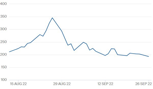 De TTF-gasprijs lag vanochtend weer een paar procenten hoger dan gisteren. De gasprijs blijft zich daarmee rond de 200 €/MWh bewegen. Gisteren daalde de Europese gasprijs naar het laagste prijsniveau sinds eind juli.