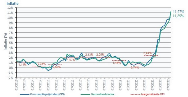 De Belgische inflatie stijgt in september van 9,94% naar 11,27%. Ze bereikt daarmee het hoogste niveau sinds augustus 1975, toen de inflatie uitkwam op 11,42%, zo meldt Statbel. De hoge inflatie deze maand is, zoals in de voorbije maanden, voor een groot deel te wijten aan de hoge energieprijzen.