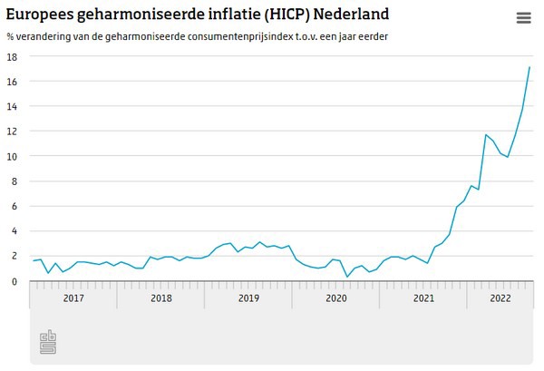 De prijzen van consumentenproducten zijn in september gemiddeld 17,1 procent duurder geworden in vergelijking met september 2021. Niet eerder liep de inflatie zo hard op. Dat meldt het Centraal Bureau voor de Statistiek (CBS) in een eerste raming, op basis van de geharmoniseerde Europese meetmethode. In augustus was dat 13,7 procent. Energie levert momenteel een belangrijke bijdrage aan de totale inflatie. De prijsontwikkeling van energie wordt door het CBS gemeten op basis van nieuwe contracten.