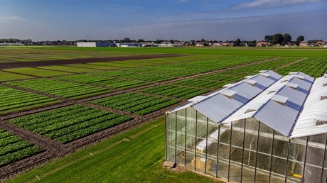 Spinazievelden naast de kas en op de achtergrond het zaadpakhuis bij Pop Vriend Seeds tijdens demodagen in 2018. Fotocredits: Costas Ganasos Photography