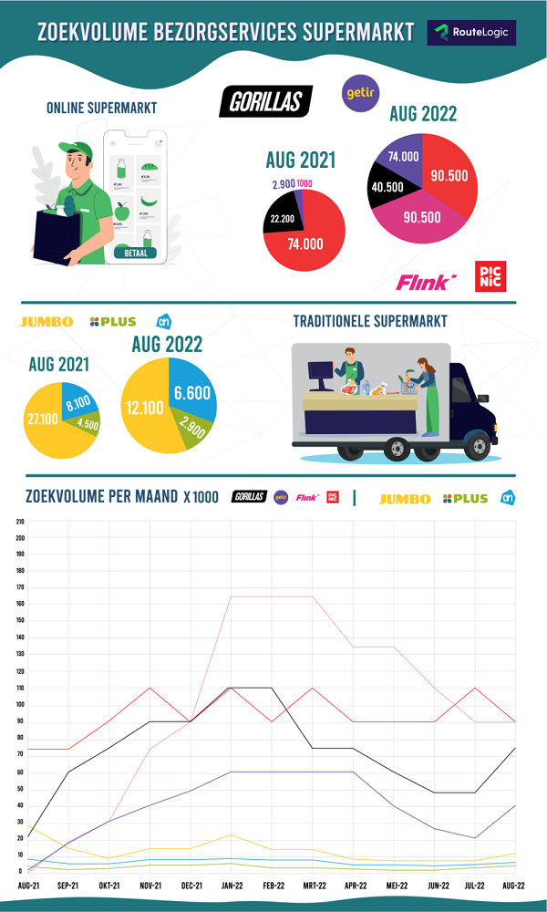 De consument zoekt namelijk in Google maandelijks (veel) meer én steeds vaker naar de services van een online supermarkt. Online supermarkten als Picnic en Flink krijgen de voorkeur boven de bezorgservices van de traditionele supermarkten wanneer de consument op zoek gaat naar een boodschappen bezorgservice. In 2021 wonnen de online supermarkten al van de traditionele supermarkt, maar in 2022 lijkt de genadeklap gegeven te zijn. In een jaar tijd groeide het zoekvolume naar de vier grootste online supermarkten met 195%. Terwijl het zoekvolume naar de bezorgservices van de drie grootste fysieke supermarkten daalde met 46%.
