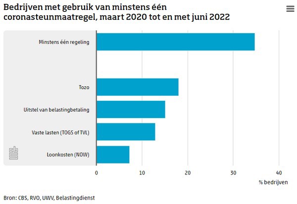 In de periode maart 2020 tot en met juni 2022 deed 35 procent van de bedrijven beroep op een van de financiële coronasteunmaatregelen. De meeste bedrijven deden beroep op de Tijdelijke overbruggingsregeling zelfstandig ondernemers (Tozo), die vooral gericht was op kleine zelfstandig ondernemers. 18 procent van alle bedrijven in Nederland maakte gebruik van de Tozo. Drie andere veelgebruikte soorten regelingen zijn het bijzonder uitstel van belastingbetaling, een vastelastenregeling (TOGS of TVL) en de Tijdelijke Noodmaatregel Overbrugging voor Werkgelegenheid (NOW).