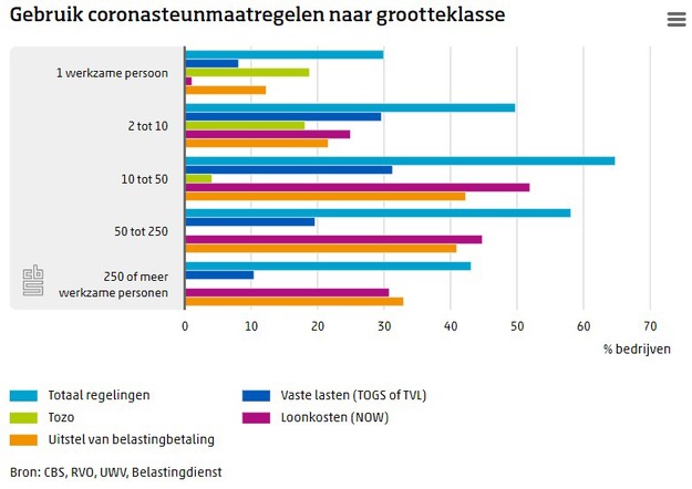 Bedrijven in het midden- en kleinbedrijf maakten vooral gebruik van de loonkostenregeling en in iets mindere mate van uitstel van belastingbetaling. De verschillende regelingen zijn bedoeld voor verschillende typen bedrijven. Zo was de loonkostenregeling vooral bedoeld voor bedrijven met personeel voor het doorbetalen van hun werknemers, terwijl de Tozo meer gericht was op kleine zelfstandig ondernemers voor hun eigen levensonderhoud. Een tegemoetkoming voor vaste lasten werd relatief het vaakst aangevraagd door bedrijven van 2 tot 10 en van 10 tot 50 werkzame personen. Bedrijven met één werkzame persoon of met 2 tot 10 werkzame personen gebruikten relatief het vaakst de Tozo-regeling. Grote bedrijven, met minstens 250 werkzame personen, vroegen vooral uitstel van belastingbetaling en deden een beroep op de loonkostenregeling.