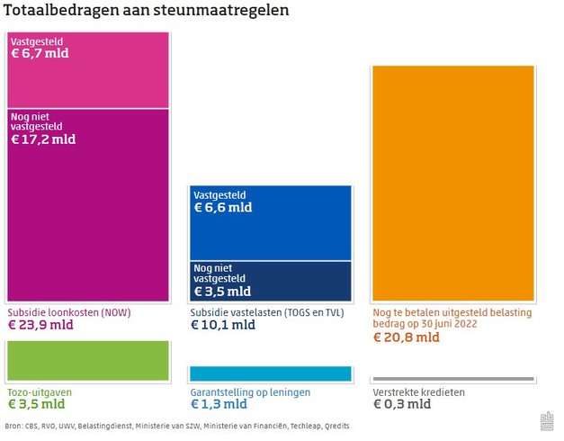 Op 30 juni 2022 bedroeg de totale subsidie aan loonkosten en vaste lasten 34 miljard euro. Omdat nog niet alle verstrekte subsidies definitief zijn vastgesteld, bestaat dit subsidiebedrag uit een vastgesteld en een nog niet vastgesteld bedrag. Het merendeel van het bedrag dat bedrijven ontvingen bestond uit een tegemoetkoming voor de loonkosten (23,9 miljard). Er stond op 30 juni 2022 in totaal 20,8 miljard euro uit aan uitgestelde belastingen van bedrijven. Zij hebben vijf tot zeven jaar na 1 oktober 2022 om dit bedrag af te lossen. De totale Tozo-uitgaven bedroegen ongeveer 3,5 miljard euro. Daarnaast stond de overheid garant voor 1,3 miljard euro. Dit betrof veelal bestaande regelingen met een corona-uitbreiding. Tot slot verstrekte de overheid 0,3 miljard euro aan extra kredieten vanuit specifieke regelingen vanwege de coronacrisis.