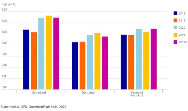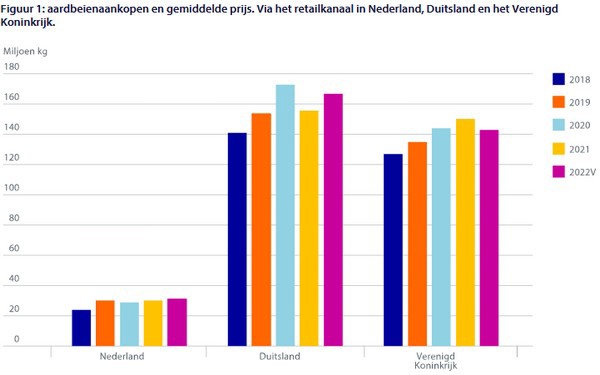 Aardbeienaankopen. Via het retailkanaal in Nederland, Duitsland en het Verenigd Koninkrijk. Bron: Kantar, GFK, GroentenFruit Huis, 2022. Opmerking bij de cijfers: 2022 is een schatting op basis van de cijfers van de eerste helft van het jaar. Cijfers van het Verenigd Koninkrijk zijn op basis van 52 weken t/m 7 augustus. Prijzen zijn in EUR/kg voor Nederland en Duitsland en GBP/kg voor het Verenigd Koninkrijk.