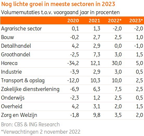 De horeca maakt dit jaar een grote inhaalslag met een verwachte volumegroei van rond de 30%. Desondanks is de horeca eind 2022 qua volume nog altijd niet terug op het pre-coronaniveau van eind 2019. De vooruitzichten voor de sector voor 2023 zijn gematigd positief met een volumegroei van circa 5%. Dit betreft deels nog herstel van de coronapandemie, aangezien de horeca in de eerste twee maanden van 2022 nog met beperkingen te maken had. Met een historisch laag consumentenvertrouwen, hoge inkoop- en energiekosten en stijgende lonen blijven het uitdagende tijden voor de sector. Veel huishoudens zullen bij de aanhoudend hoge prijzen vroeg of laat gaan bezuinigen op minder essentiële consumptie, zoals etentjes en uitstapjes buiten de deur. Dankzij het omvangrijke financiële steunpakket van de overheid blijft de koopkracht volgend jaar nog enigszins op peil. Dit zal de vraaguitval in de horeca naar verwachting enigszins dempen.