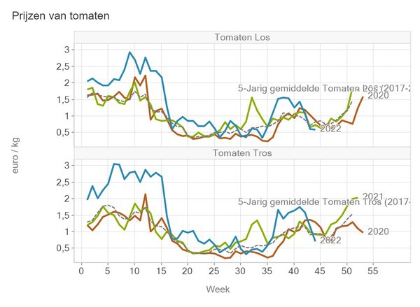 In beide gevallen betekent de recente prijsdaling dat de tomatenprijs onder het vijfjarig gemiddelde is gezakt. Richting eind november vindt de tomatenprijs over het algemeen de weg naar boven weer. Anders dan de afgelopen jaren wordt er minder belicht en verwarmd geteeld.