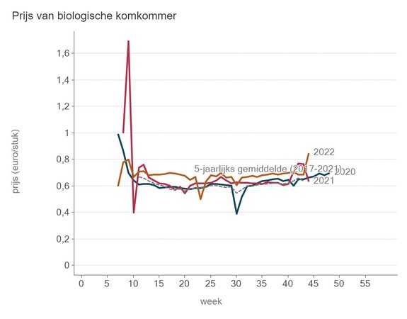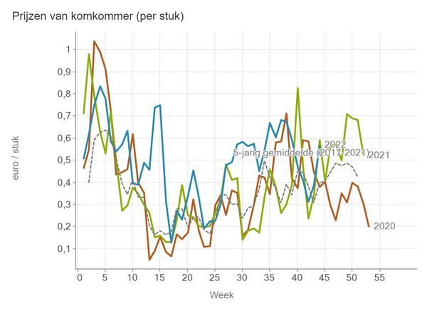 De middenprijs voor komkommer heeft sinds week 43 de weg naar boven weer gevonden. Daarmee ligt de prijs ook weer boven het vijfjarig gemiddelde. De prijspiek in week 44 kan net niet tippen aan die in week 44 in 2021. Afgerond komt de stuksprijs op net geen 57 eurocent uit. Doorgaans stijgt de komkommerprijs in november richting week 50 gestaag door.
