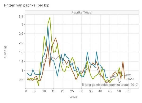 Sinds eind september daalt ook de paprikaprijs, vooral sinds medio oktober gaat de prijsval hard. Afgelopen week is de prijsval gestopt. Over de hele linie komt een kilo op net geen 70 eurocent uit. Vooral geel spring eruit met een kiloprijs van 44 eurocent. Rood doet het in week 44 met 88 eurocent een stukje beter, terwijl een kilo oranje paprika's 1,52 euro oplevert.