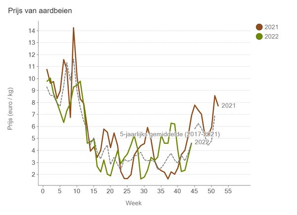 De middenprijs voor aardbeien steeg voor de tweede week op rij. Een kilo leverde gemiddeld 4,64 euro op. Elsanta leverde gemiddeld 4,89 euro op. De prijs ligt weer op het vijfjarig gemiddelde en stijgt mee in lijn met het vijfjarig gemiddelde.