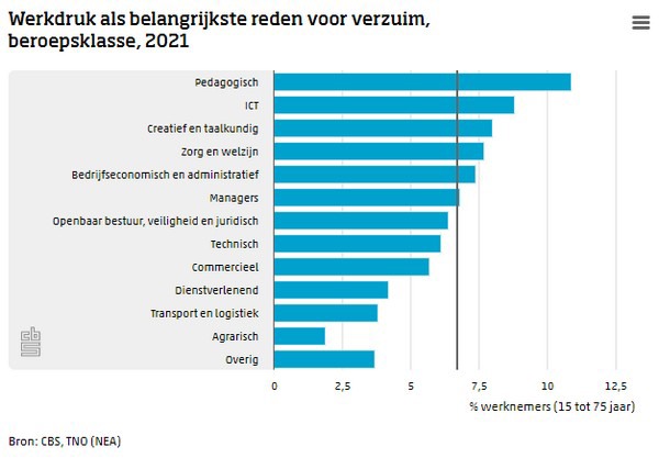 10,9 procent van de werknemers met een pedagogisch beroep noemde in 2021 werkdruk als belangrijkste reden voor het laatste verzuim. Docenten in het wetenschappelijk onderwijs, het hoger onderwijs en op middelbare scholen gaven dit het vaakst aan. Verzuim door werkdruk werd ook relatief vaak genoemd door werknemers met een ICT-beroep, een creatief- en taalkundig beroep, of een zorg- en welzijnsberoep. Bij werknemers in agrarische beroepen, in beroepen in transport en logistiek, en in dienstverlenende beroepen, kwam verzuim door werkdruk veel minder vaak voor.
