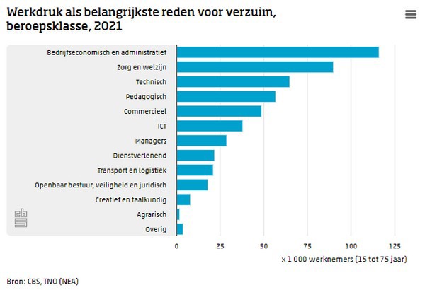 Bijna 520 duizend werknemers (6,7 procent) van 15 tot 75 jaar in Nederland noemden in 2021 werkdruk als belangrijkste reden voor hun laatste verzuim op het werk. Deze werknemers waren twee keer zo lang afwezig van het werk vergeleken met alle werknemers die hadden verzuimd. Dit meldt het CBS op basis van cijfers uit de Nationale EnquĂȘte Arbeidsomstandigheden (NEA) van het CBS en TNO.