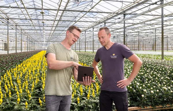 Henry van der Meer productspecialist gewasbescherming Royal Brinkman (l) presenteert de adviesgenerator aan Erwin van Luijk, J&A Flowers