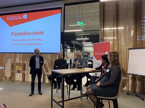 Paneldiscussie op het Slotsymposium De Waarde(n) van Groenten en Fruit met (vlnr) Herman Peppelenbos (HAS), Wilco van den Berg (GroentenFruit Huis), Rob Baan (Koppert Kress), Danielle Bruin (Bejo) en Ali de Boer (UMCM)