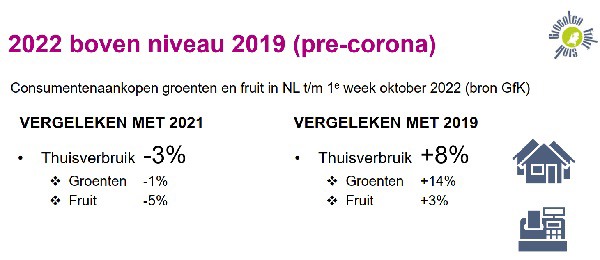 Wilco dook in de cijfers en constateert dat de consumptie van groenten tot half oktober 2022 op peil blijft, de consumptie van fruit daalt ten opzichte van 2021. Vergeleken met pre-corona steken de cijfers echter gunstig af. Groentenaankopen liggen in 2022 tot half oktober zelfs 14% hoger ten opzichte van 2019, voor fruit is dat +3%.