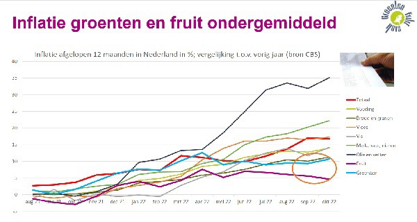 De huidige gierende inflatiecijfers gelden nadrukkelijk niet voor groenten en fruit. Voor fruit is zelfs een dalende trend ingezet vanaf juni 2022. In oktober bedroeg de inflatie bij vers fruit 5%. Dit wil dus zeggen dat fruit in oktober 5% duurder was dan een jaar terug. De inflatie van voeding totaal was ruim 14 procent. Niet alles is in prijs omhoog gegaan. Groenten als wortel (+1%), paprika (+2%) waren in de eerste helft van 2022 nauwelijks duurder dan in dezelfde periode vorig jaar, bloemkool was zelfs stukken goedkoper (-14%) net als appels (-7%), aardbeien (-5%) en mango (-5%).