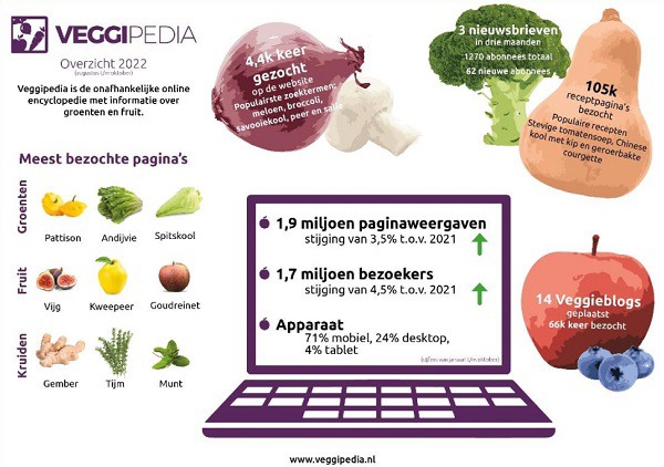 De consument is op zoek naar inspiratie en kennis over groenten en fruit. Veggipedia, een onafhankelijke encyclopedie verzorgd door GroentenFruit Huis met informatie over groenten en fruit, kent een groeiend aantal bezoekers. Er is interesse in zowel bekende producten als in specialiteiten. Binnen de categorie groenten is vaak gezocht op pattison maar ook op andijvie en spitskool, bij fruit ging dat om vijg, kweepeer en goudreinet en in kruiden om gember, tijm en munt.